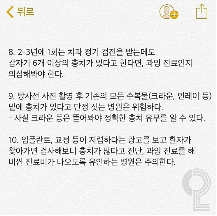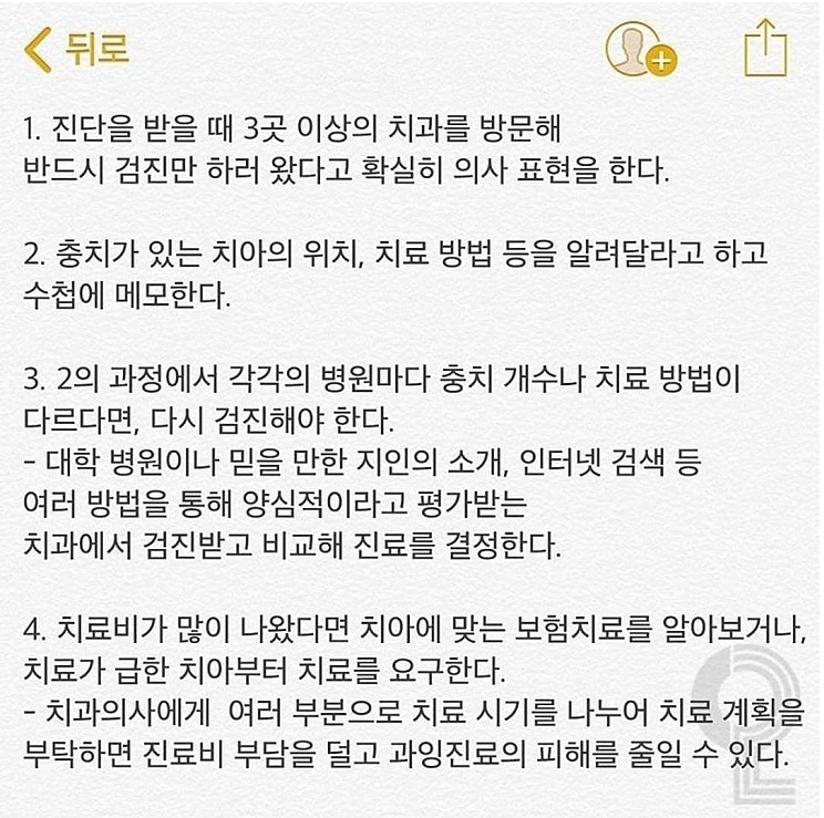 치과에서 과잉진료를 방지하는 팁 페이지 정보 작성자 최고관리자 쪽지보내기 메일보내기 자기소개 아이디로 검색 전체게시물 쪽지보내기 메일보내기 자기소개 아이디로 검색 전체게시물 아이피 작성일 2021.04.08 20:35 조회 13,594 목록 본문 여기서도 한인 치과 갈때는 유용하겠네요.. 추천 0 관련자료 0 Comments 등록된 댓글이 없습니다. 로그인한 회원만 댓글 등록이 가능합니다. 목록