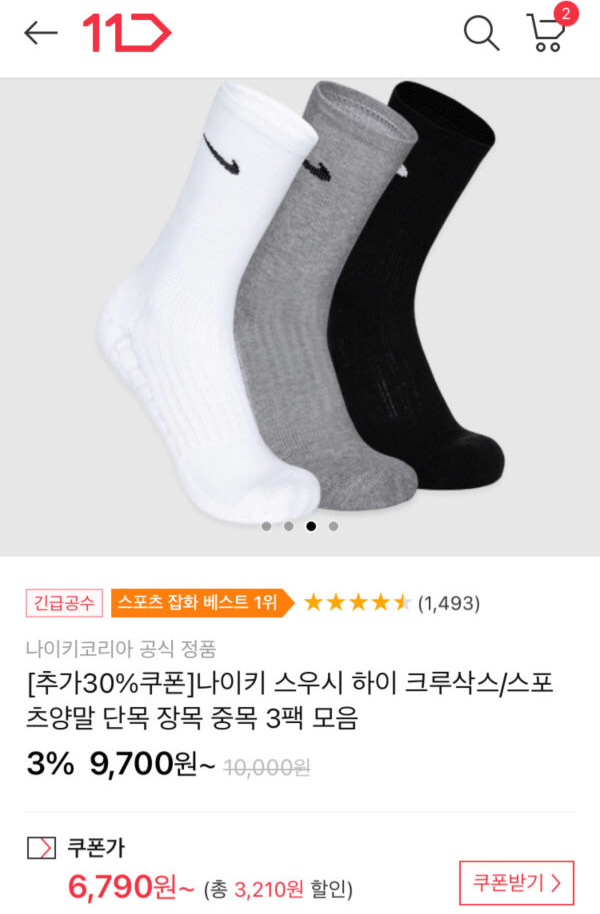 [11번가] 나이키 양말 3팩 (8,330원)